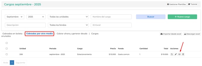 - Se cobrará por otro medio: Este se cobrará de forma directa al copropietario, es decir, no saldrá en la estado de cuenta, ni en la cartola de cuotas de mantenimiento y pagos, ya que se realizó por otro medio (Ejemplo: Efectivo), se lo puedes notificar desde el ítem de Acciones en el icono que tiene una carta que se llama Notificar cargo.