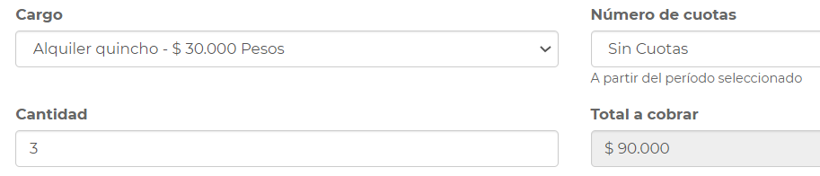 - Cantidad: Indique cuantas veces se cobrará dicho cargo, por ejemplo si al mes alquilo tres veces el quincho, para no estar registrando tres veces el mismo cargo, indica en la plantilla la cantidad de 3, de forma automática el total a cobrar aumentará.