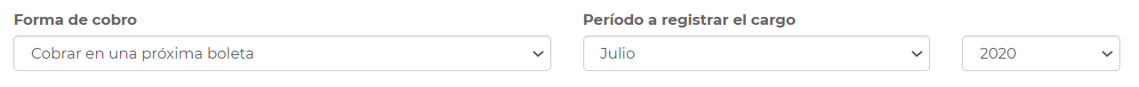 - Período a registrar el cargo : Mes del cuota de mantenimiento que se cobrará, por defecto te mostrará del próximo cuota de mantenimiento a emitir, pero puedes elegir otro período de cobro.