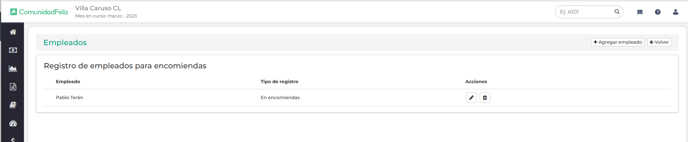 El módulo de encomiendas cuenta un registro de empleados donde toma la información de los empleados registrados en el módulo de Remuneraciones (si la comunidad es chilena y tiene activo el módulo) y empleados registrados directamente desde el módulo de encomiendas.