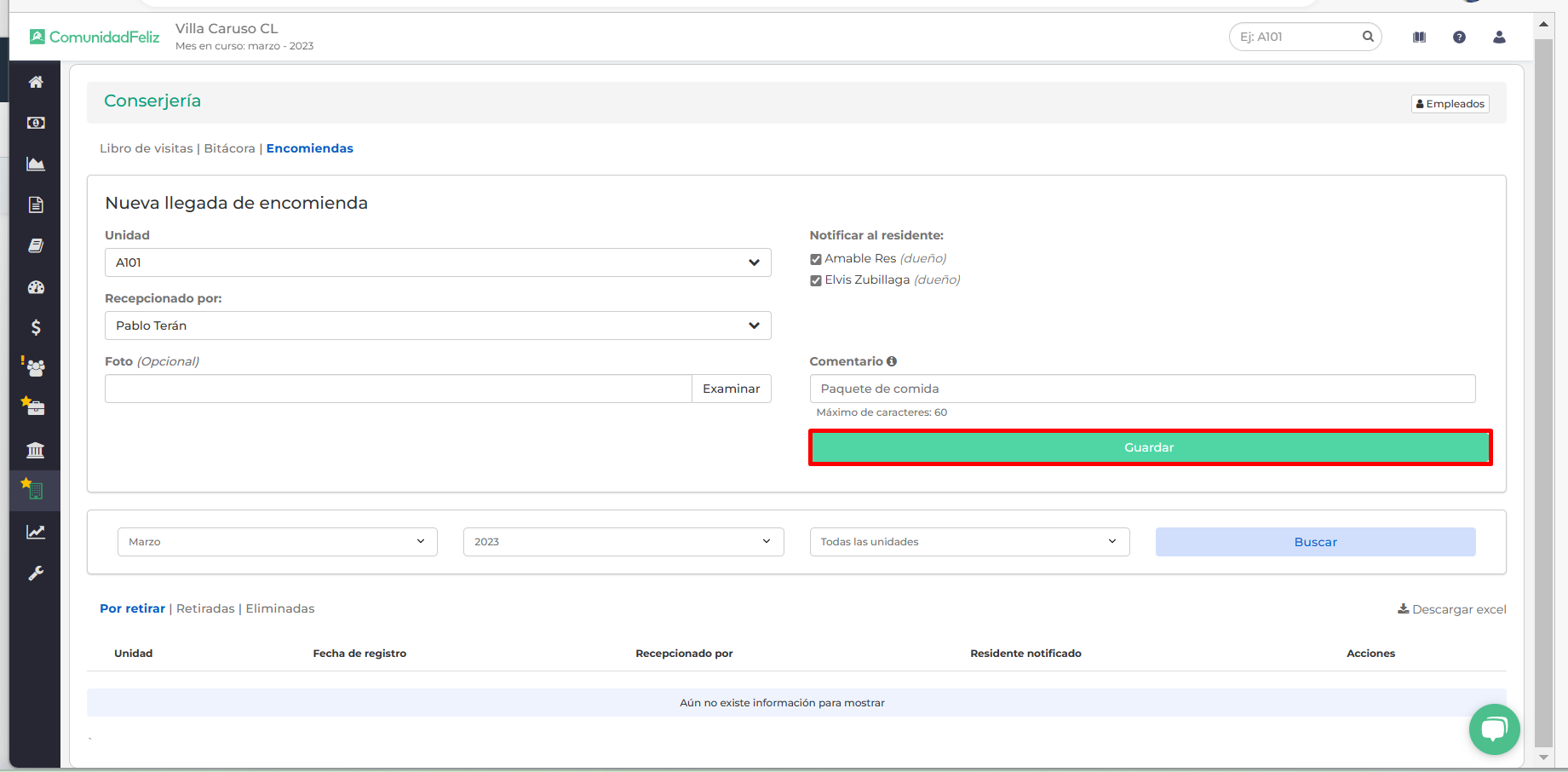 - Retiradas: todas las encomiendas ya retiradas por el residente.