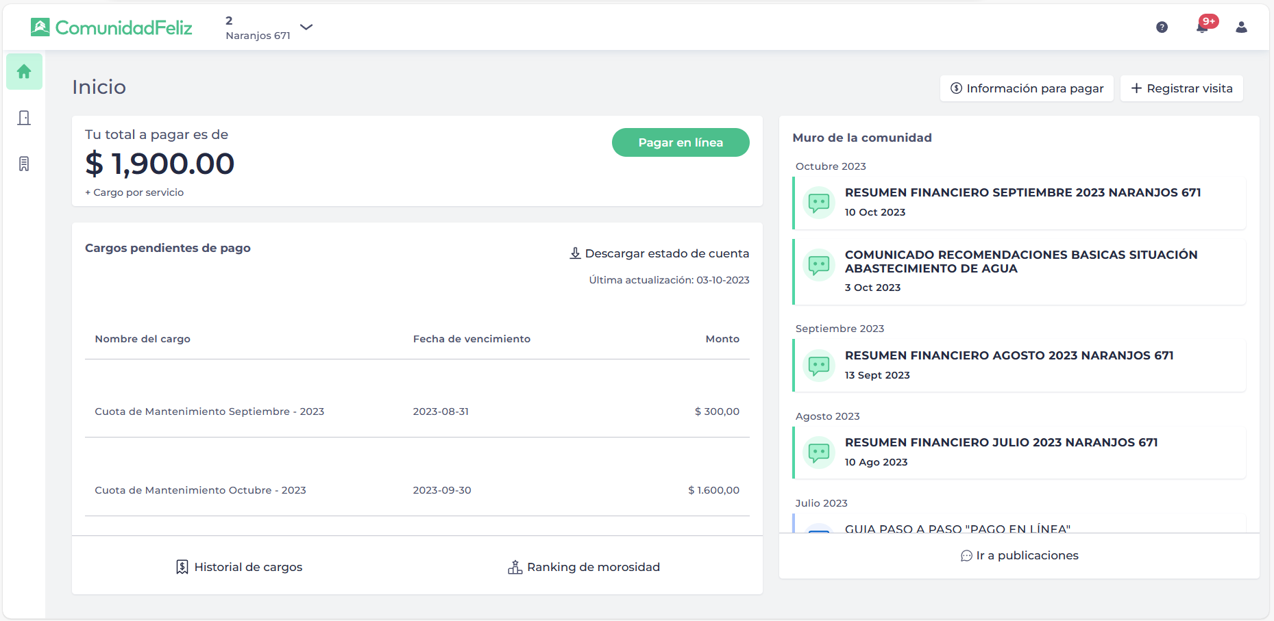 1) Para comenzar, debemos iniciar sesión en nuestra cuenta de usuario de Comunidad Feliz. Al hacerlo, se nos presentará el panel principal que contiene toda la información importante.