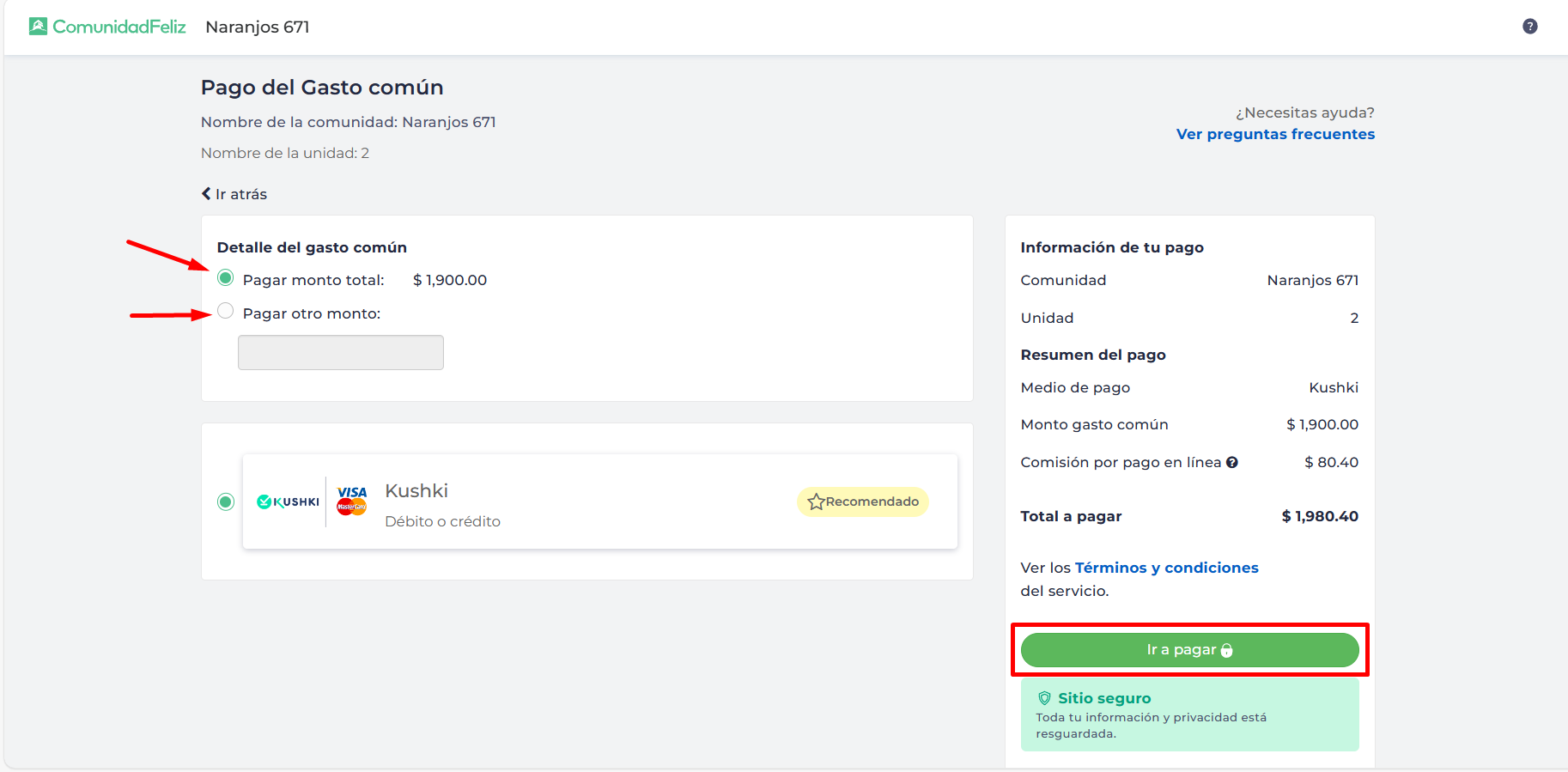3) Una vez estés en el portal de pagos, tendrás la opción de elegir el monto que deseas pagar, ya sea el total de la deuda o un monto menor o mayor. Luego, simplemente debes hacer clic en "Ir a pagar" para continuar con el proceso.