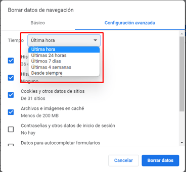 - En la parte superior, elige un intervalo de tiempo (puedes seleccionar el tiempo desde cuando deseas borrar los datos de navegación)