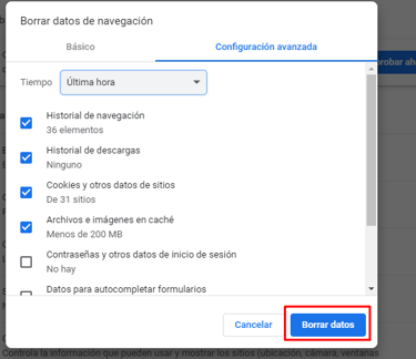 - Marca las casillas Historial de navegación , Cookies y otros datos de sitios y Archivos e imágenes almacenados en caché