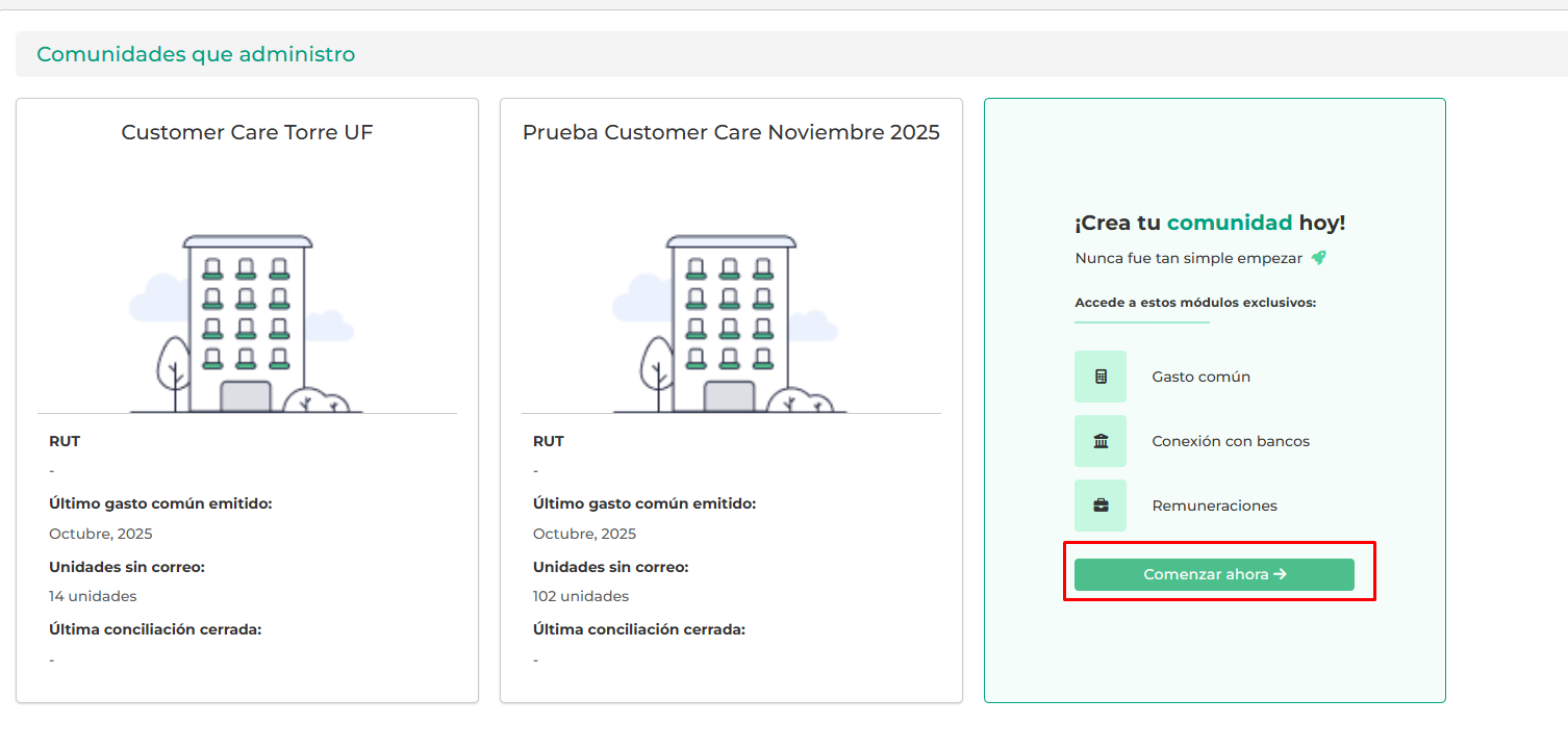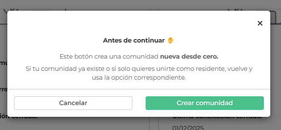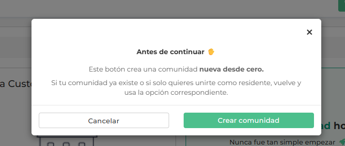 No utilices este botón si deseas ingresar a una comunidad existente como residente o colaborador.