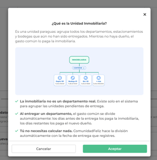 - En el caso de que tengas Inmobiliaria, debes crear la unidad "Inmobiliaria" y todas las unidades que aun no se entreguen, deberán ser cargadas como subunidades dentro de la inmobiliaria.