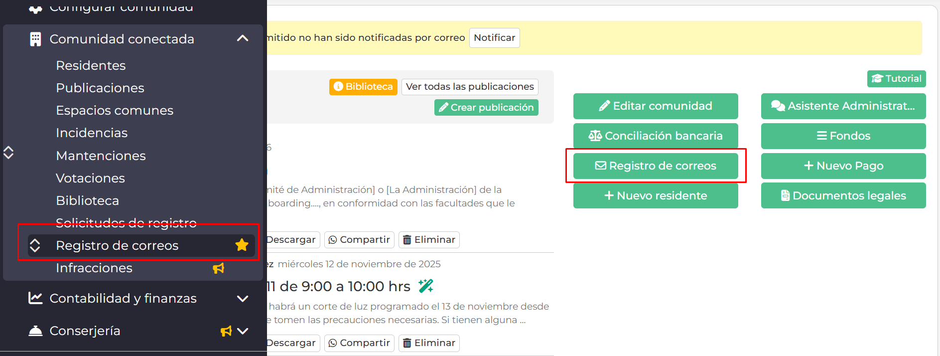 1.- Acceder al módulo Comunidad conectada, sección Registro de Correos, o desde panel, botones de accesos directos.